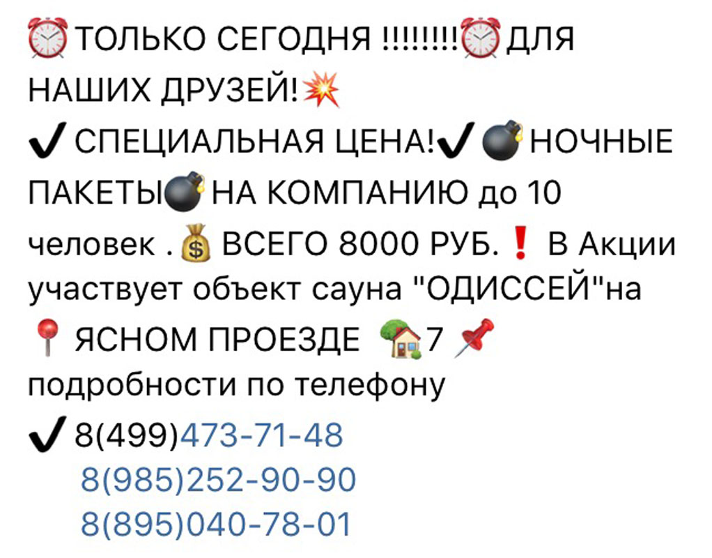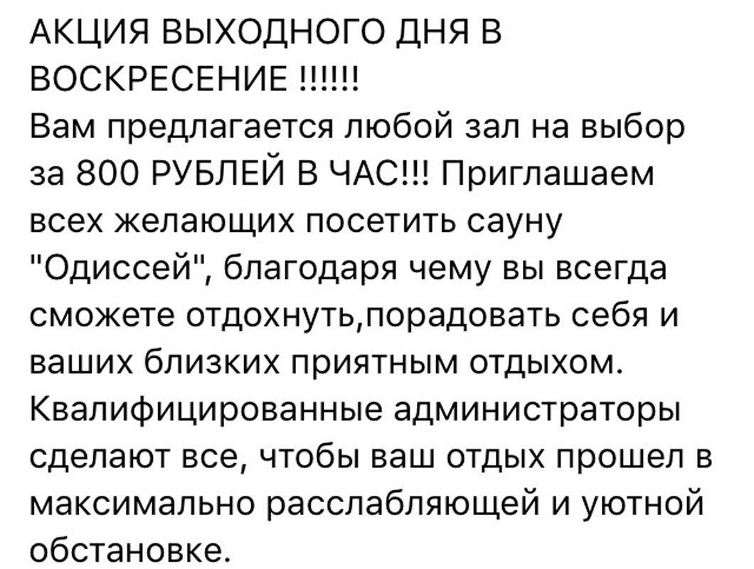 Замечательная сауна! Друзья в восторге, редко ходим в сауну, поэтому долго не могли выбрать. Выбрали Одессей и не пожалели приятная атмосфера, свежий ремонт , световое оформление тоже нам пригодилось. Вообщем мы остались довольны Администратор тоже супер всё показала, объяснила, дала понять что по любому вопросу можно обратиться и она с радостью поможет . Спасибо за хороший отдых!\"